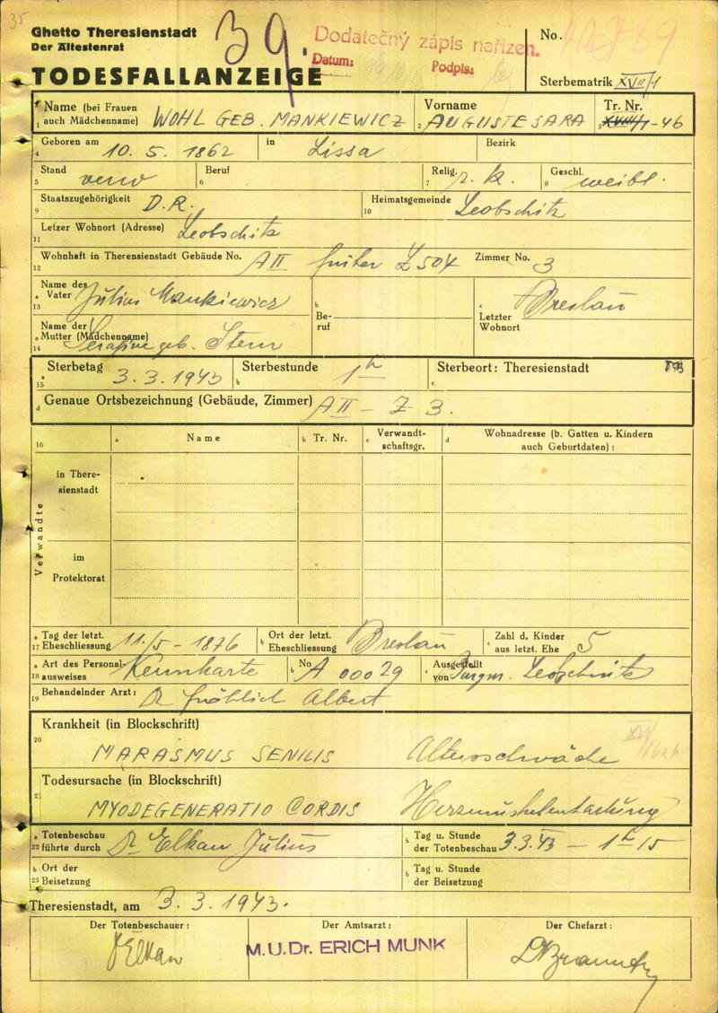 Wohl Auguste: Oznámení o úmrtí, ghetto Terezín