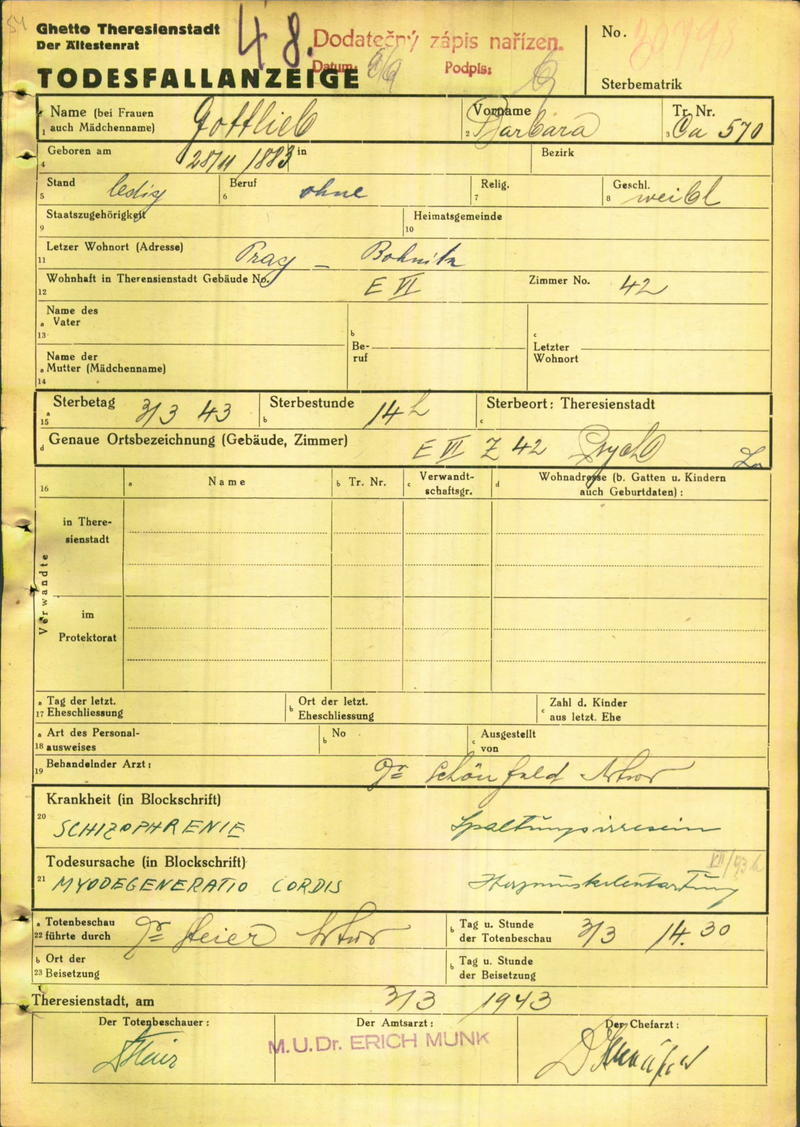 Gottliebová Barbora: Oznámení o úmrtí, ghetto Terezín