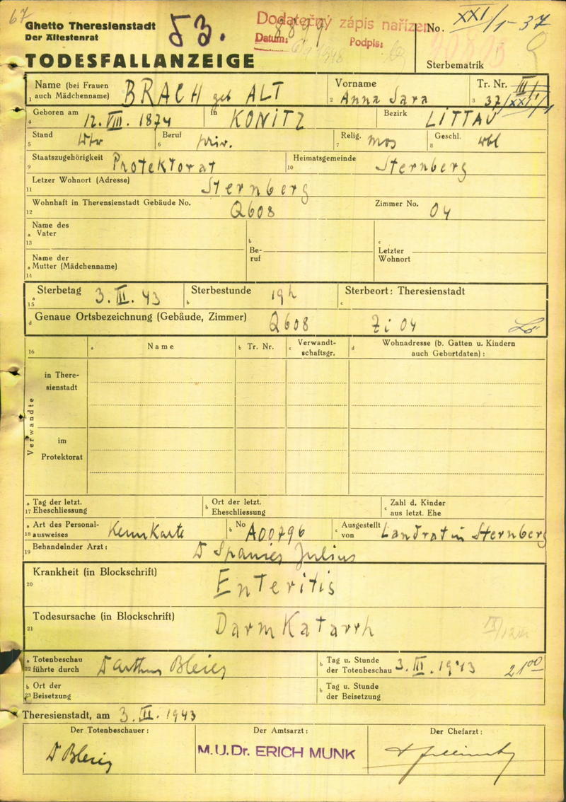 Brachová Anna: Oznámení o úmrtí, ghetto Terezín