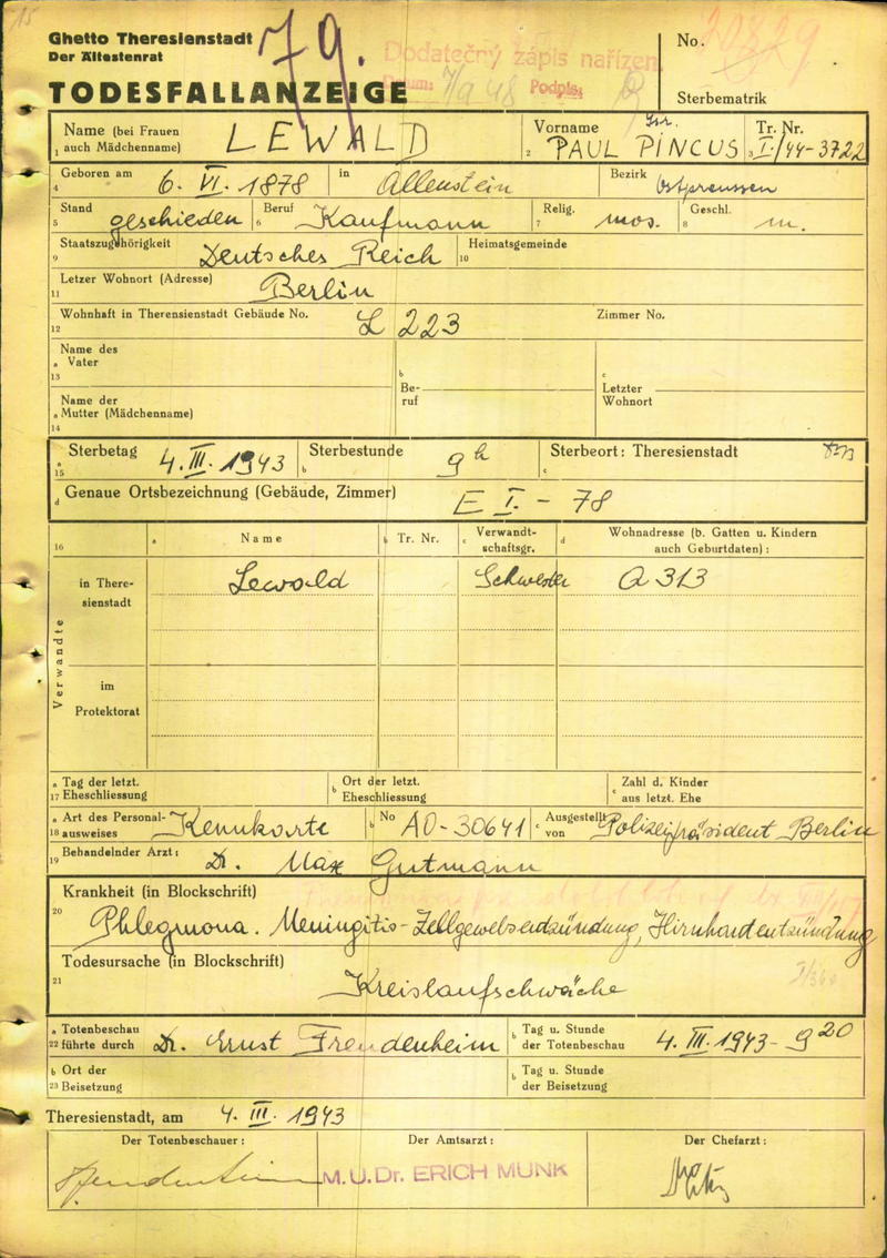 Lewald Paul Pincus: Oznámení o úmrtí, ghetto Terezín