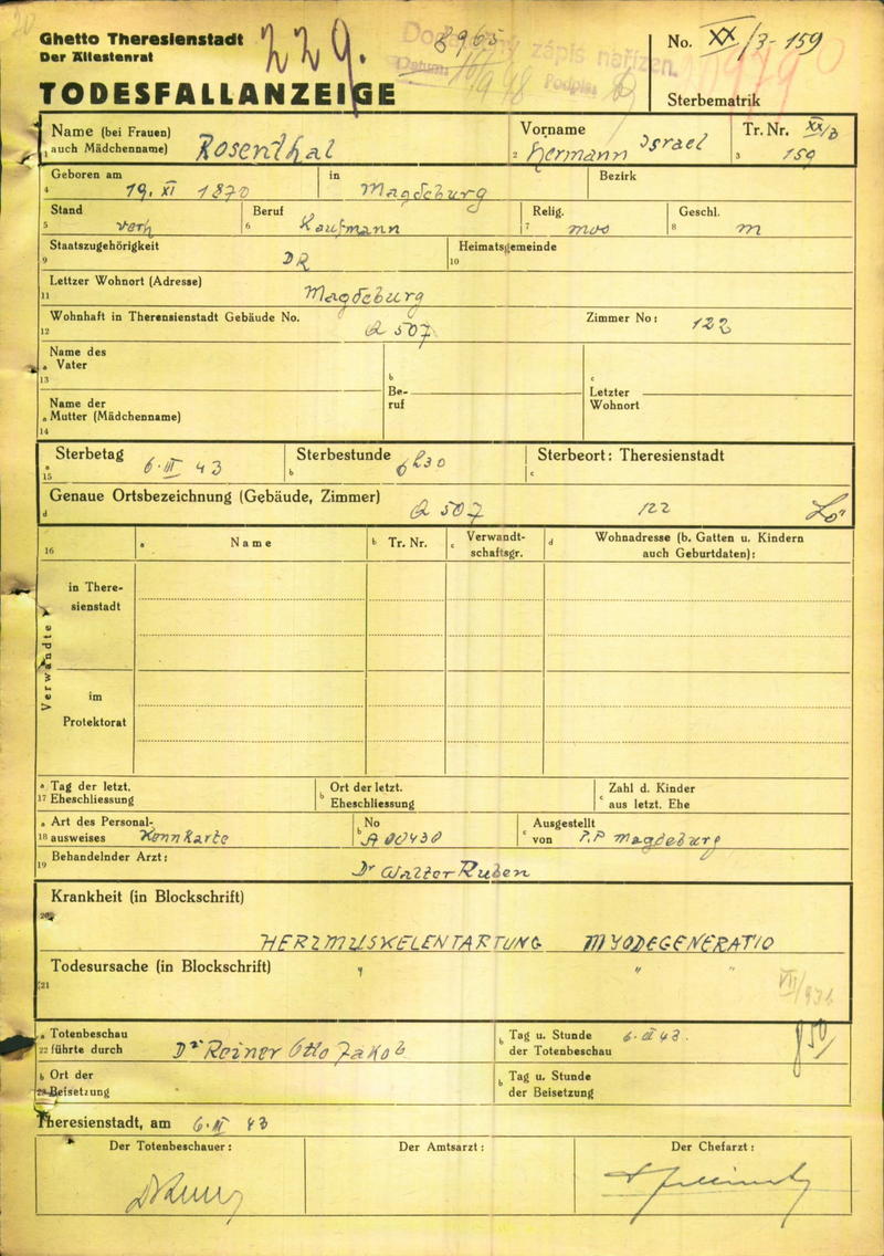 Rosenthal Hermann: Oznámení o úmrtí, ghetto Terezín