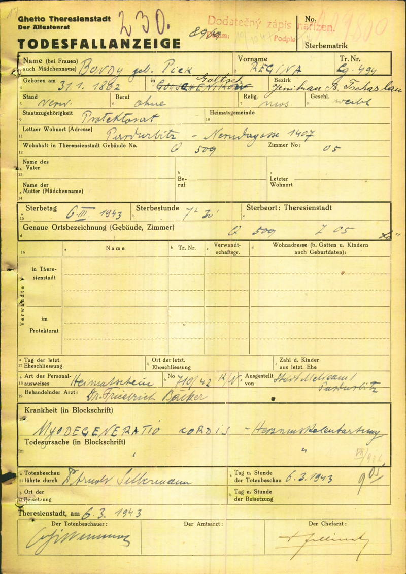 Bondyová Regina: Oznámení o úmrtí, ghetto Terezín