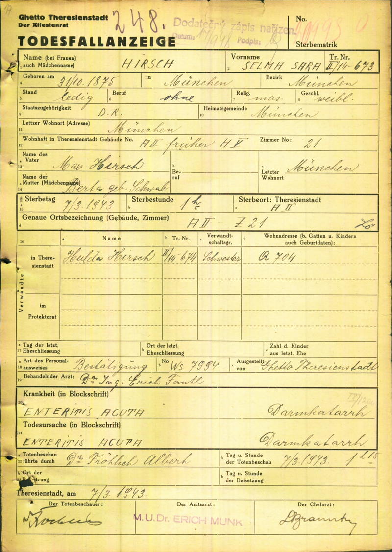 Hirsch Selma: Oznámení o úmrtí, ghetto Terezín