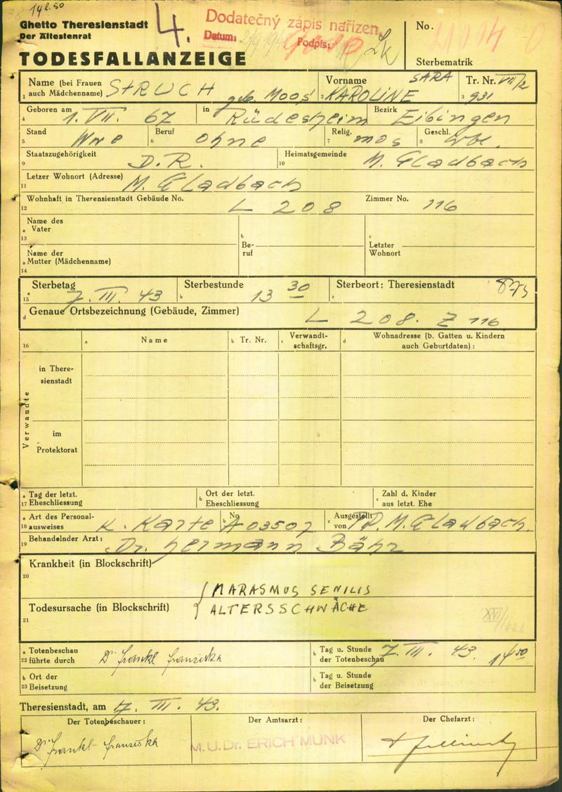 Struch Karoline: Oznámení o úmrtí, ghetto Terezín