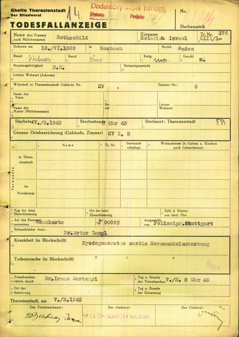 Rothschild Heinrich: Oznámení o úmrtí, ghetto Terezín