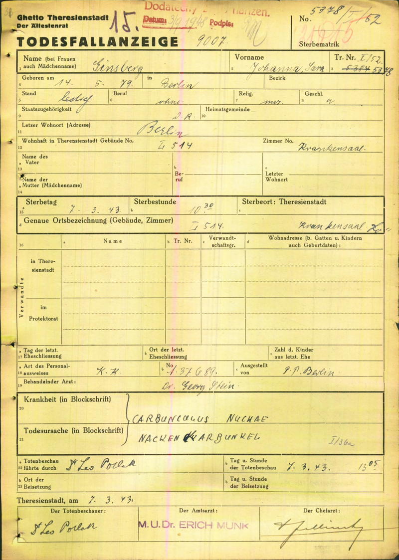 Ginsberg Johanna: Oznámení o úmrtí, ghetto Terezín