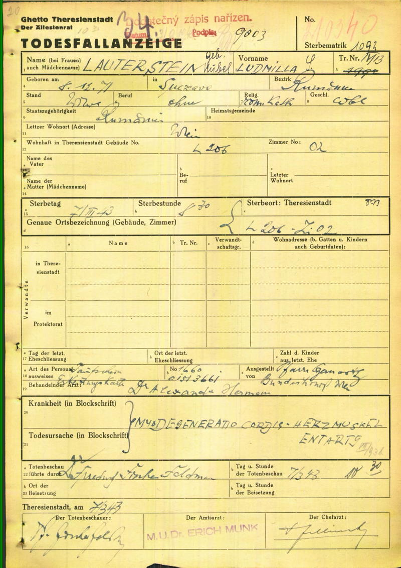 Lauterstein Ludmilla: Oznámení o úmrtí, ghetto Terezín