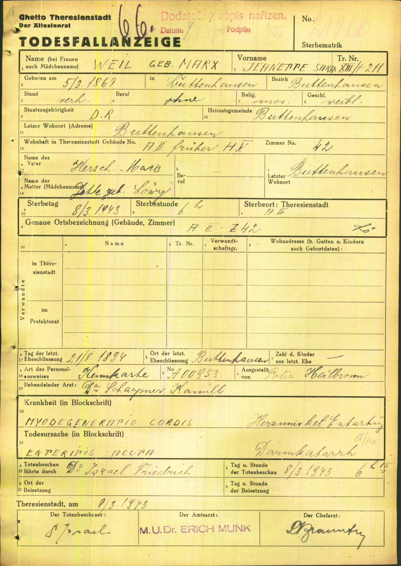 Weil Jeanette: Oznámení o úmrtí, ghetto Terezín
