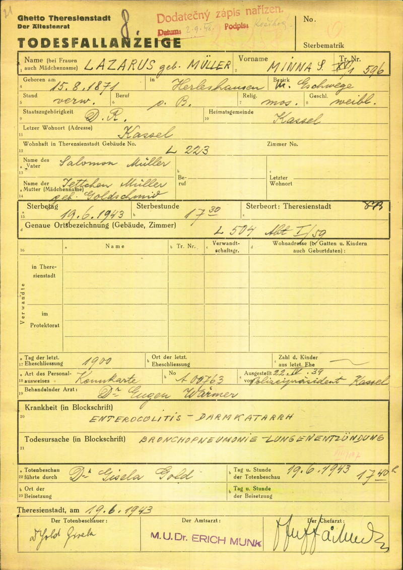 Lazarus Minna: Oznámení o úmrtí, ghetto Terezín