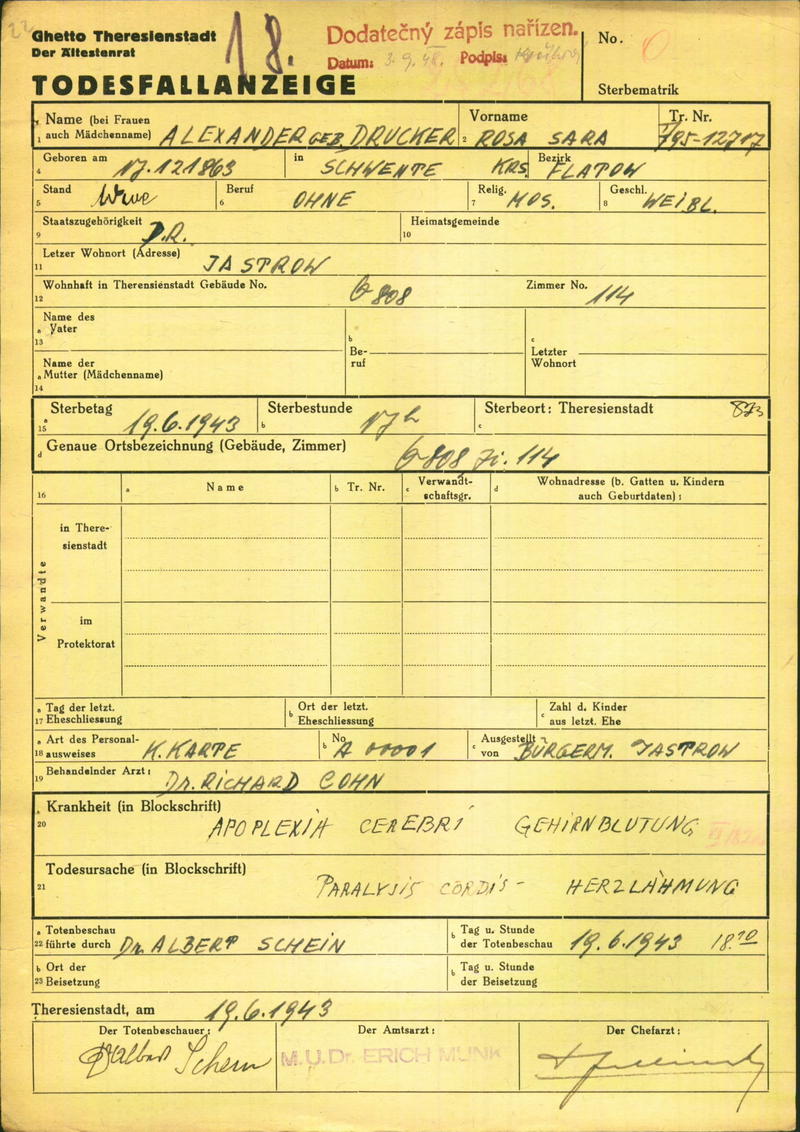 Alexander Rosa: Oznámení o úmrtí, ghetto Terezín