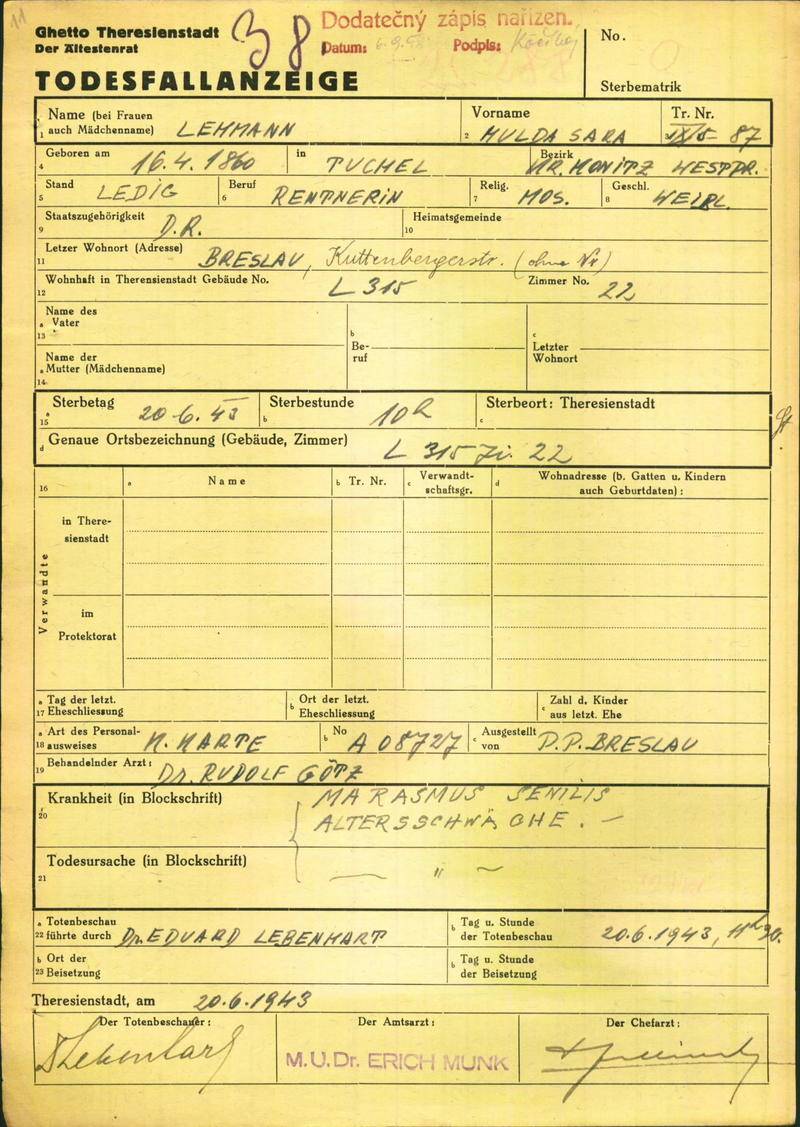 Lehmann Hulda: Oznámení o úmrtí, ghetto Terezín