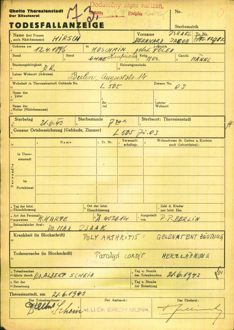 Hirsch Bernhard Jacob: Oznámení o úmrtí, ghetto Terezín