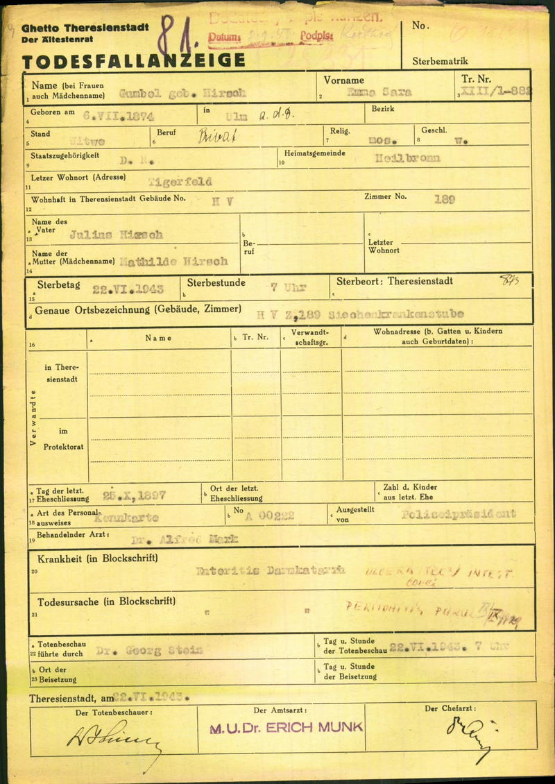Gumbel Emma: Oznámení o úmrtí, ghetto Terezín