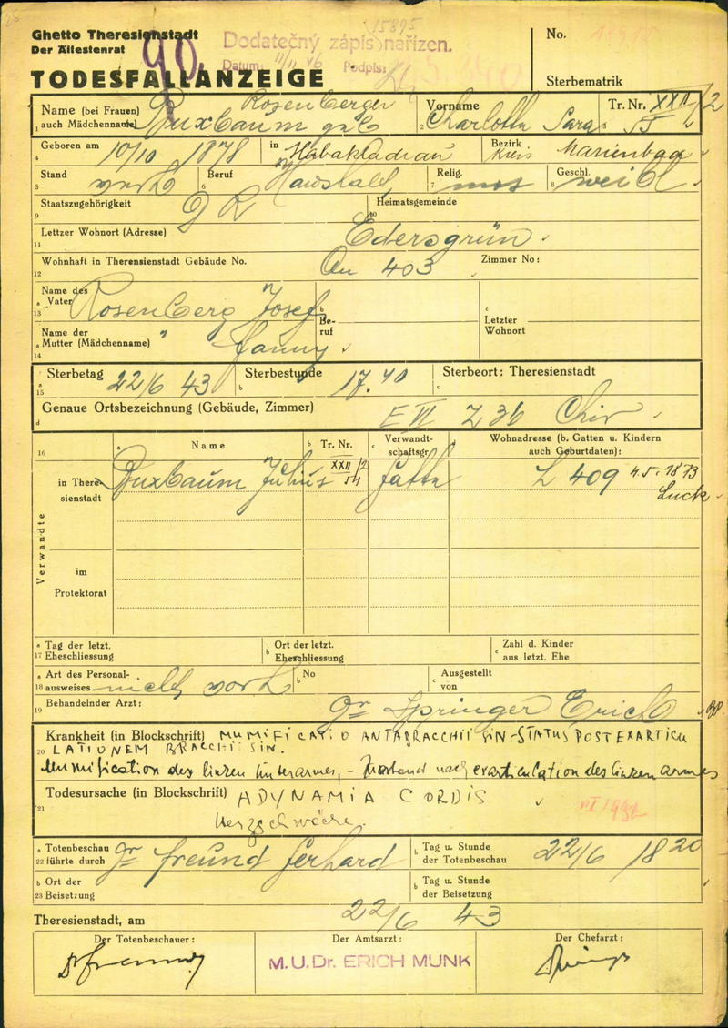 Buxbaumová Charlotte: Oznámení o úmrtí, ghetto Terezín