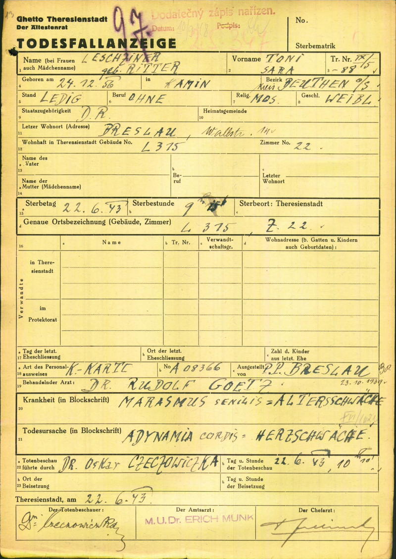 Leschziner Toni: Oznámení o úmrtí, ghetto Terezín