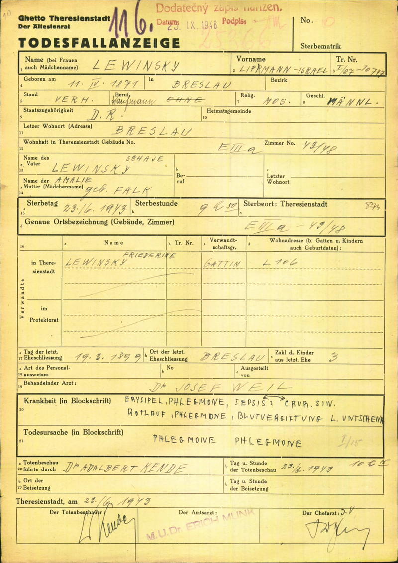 Lewinsky Lipmann: Oznámení o úmrtí, ghetto Terezín