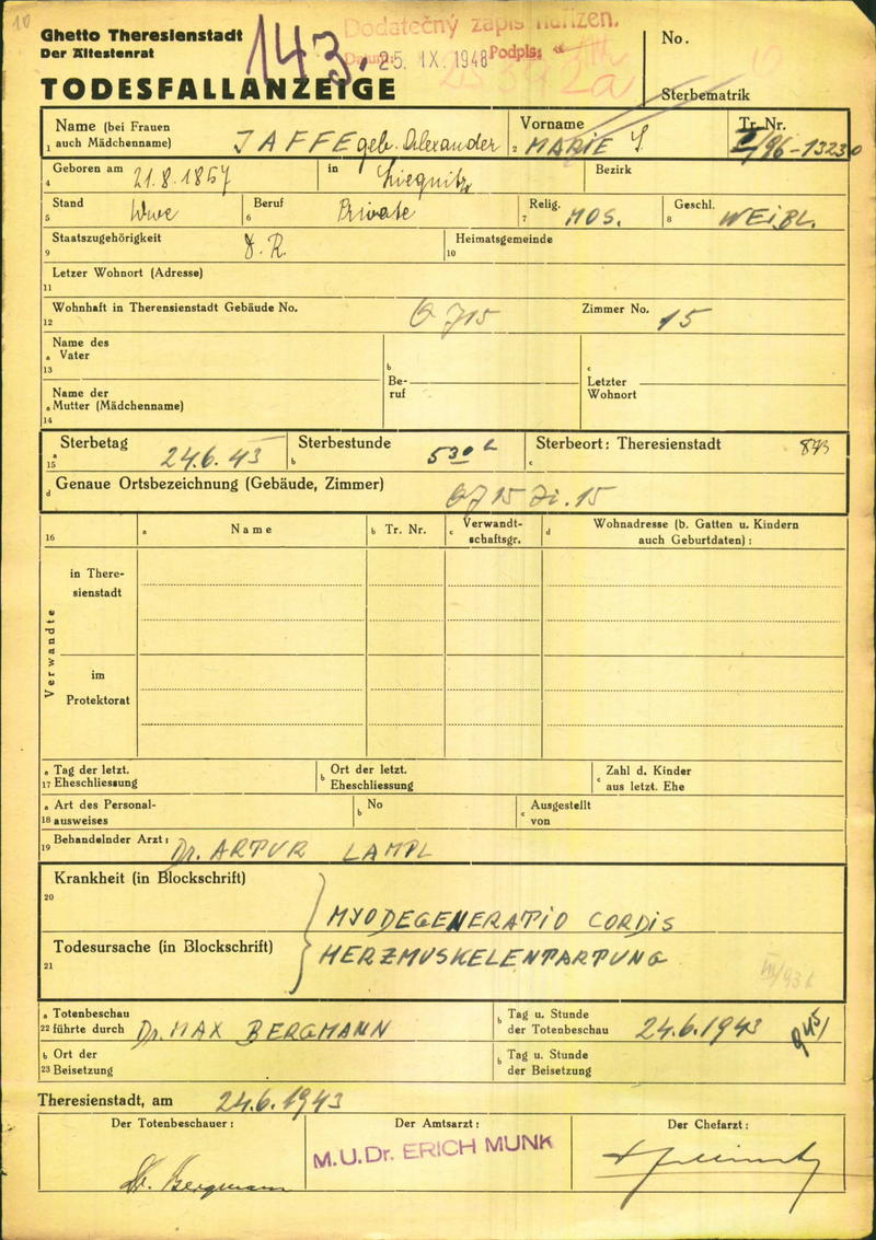 Jaffe Marie: Oznámení o úmrtí, ghetto Terezín