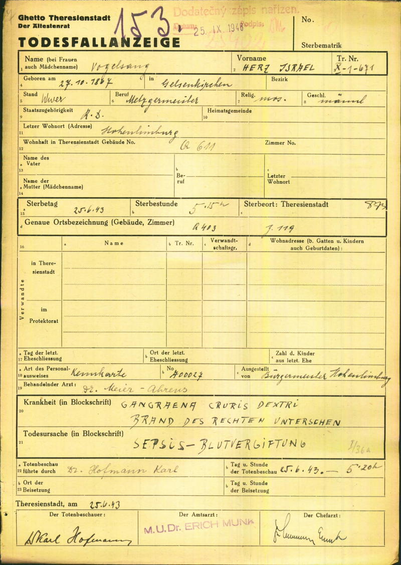 Vogelsang Herz: Oznámení o úmrtí, ghetto Terezín