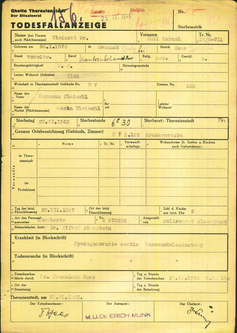 Fleischl Emil: Oznámení o úmrtí, ghetto Terezín