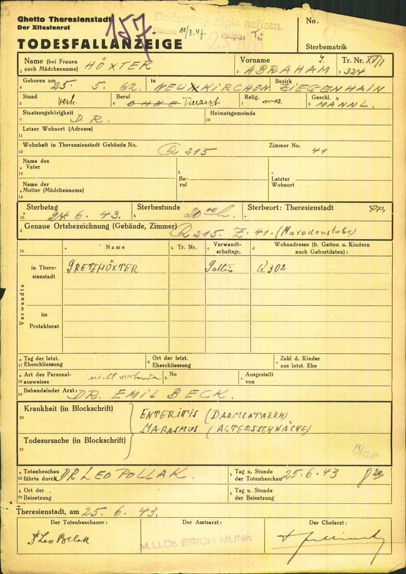 Höxter Abraham: Oznámení o úmrtí, ghetto Terezín