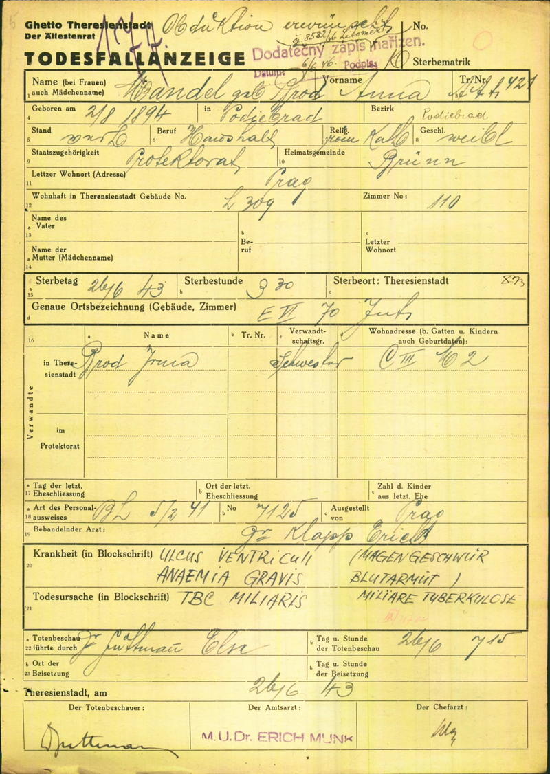 Mandelová Anna: Oznámení o úmrtí, ghetto Terezín