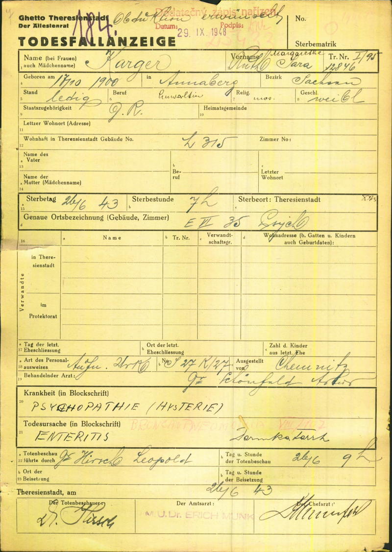 Karger Ruth: Oznámení o úmrtí, ghetto Terezín