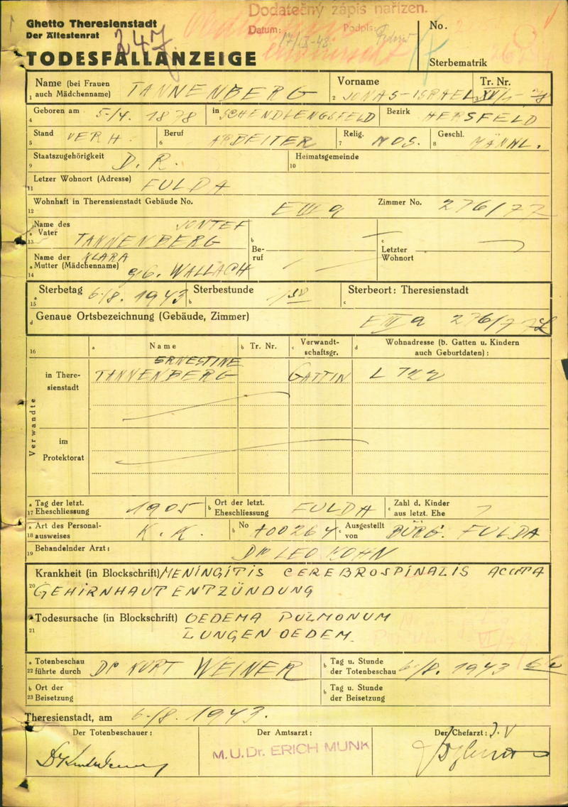 Tannenberg Jonas: Oznámení o úmrtí, ghetto Terezín