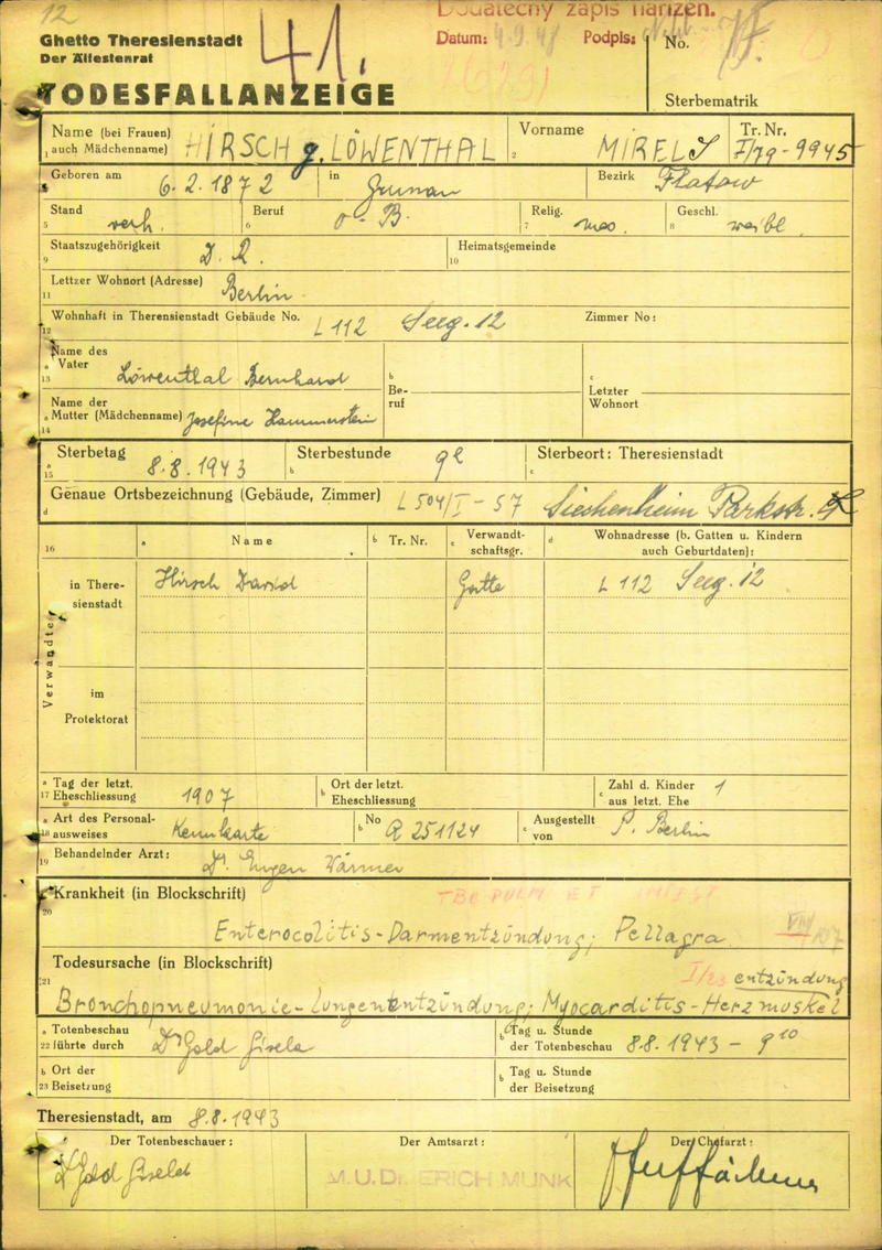 Hirsch Mirel: Oznámení o úmrtí, ghetto Terezín