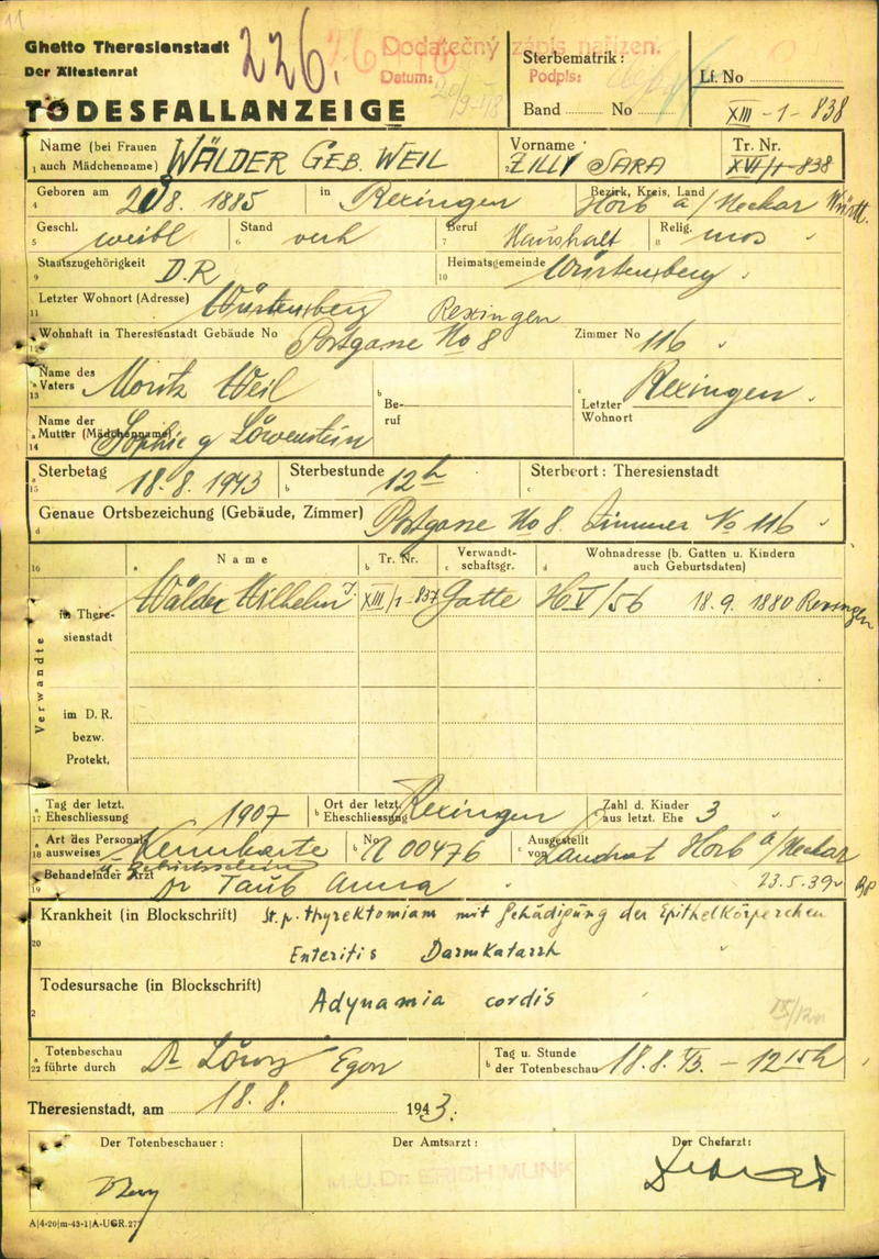 Wälder Zilly: Oznámení o úmrtí, ghetto Terezín