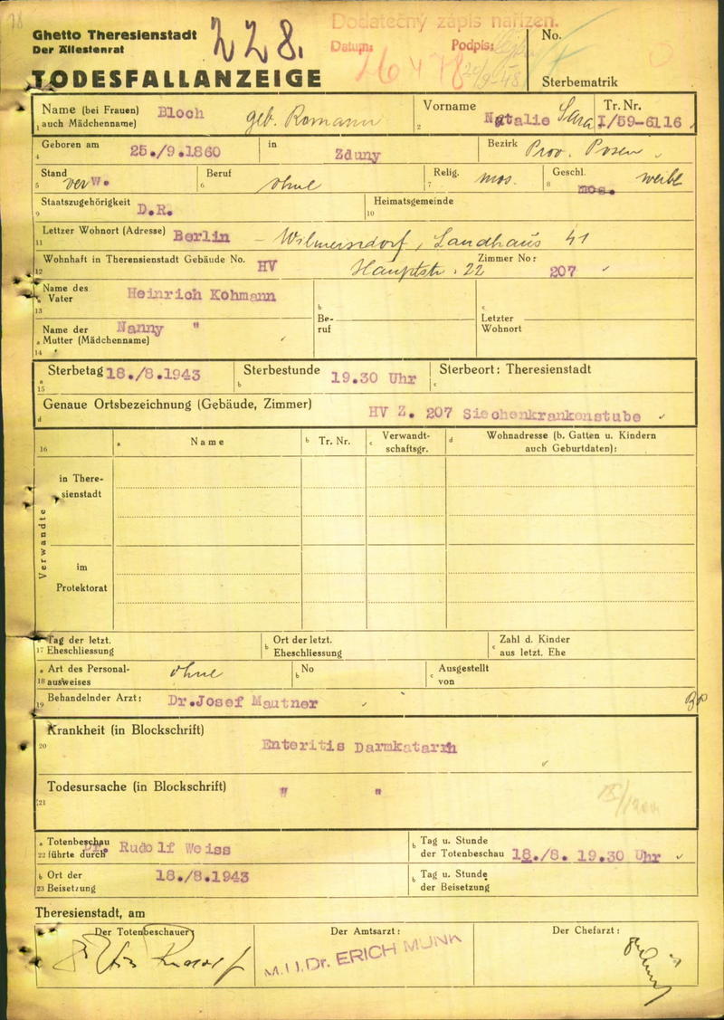 Bloch Natalie: Oznámení o úmrtí, ghetto Terezín