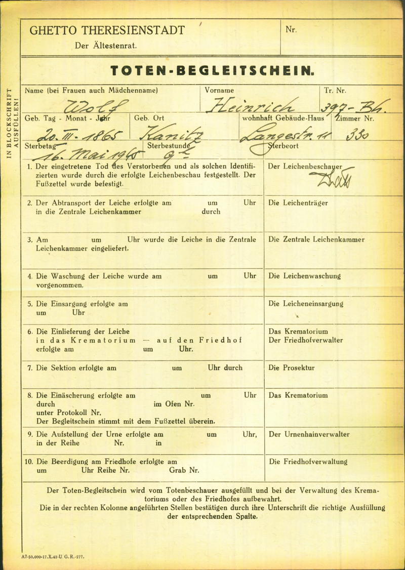 Wolf Jindřich: Doprovodný list zemřelé(ho), ghetto Terezín