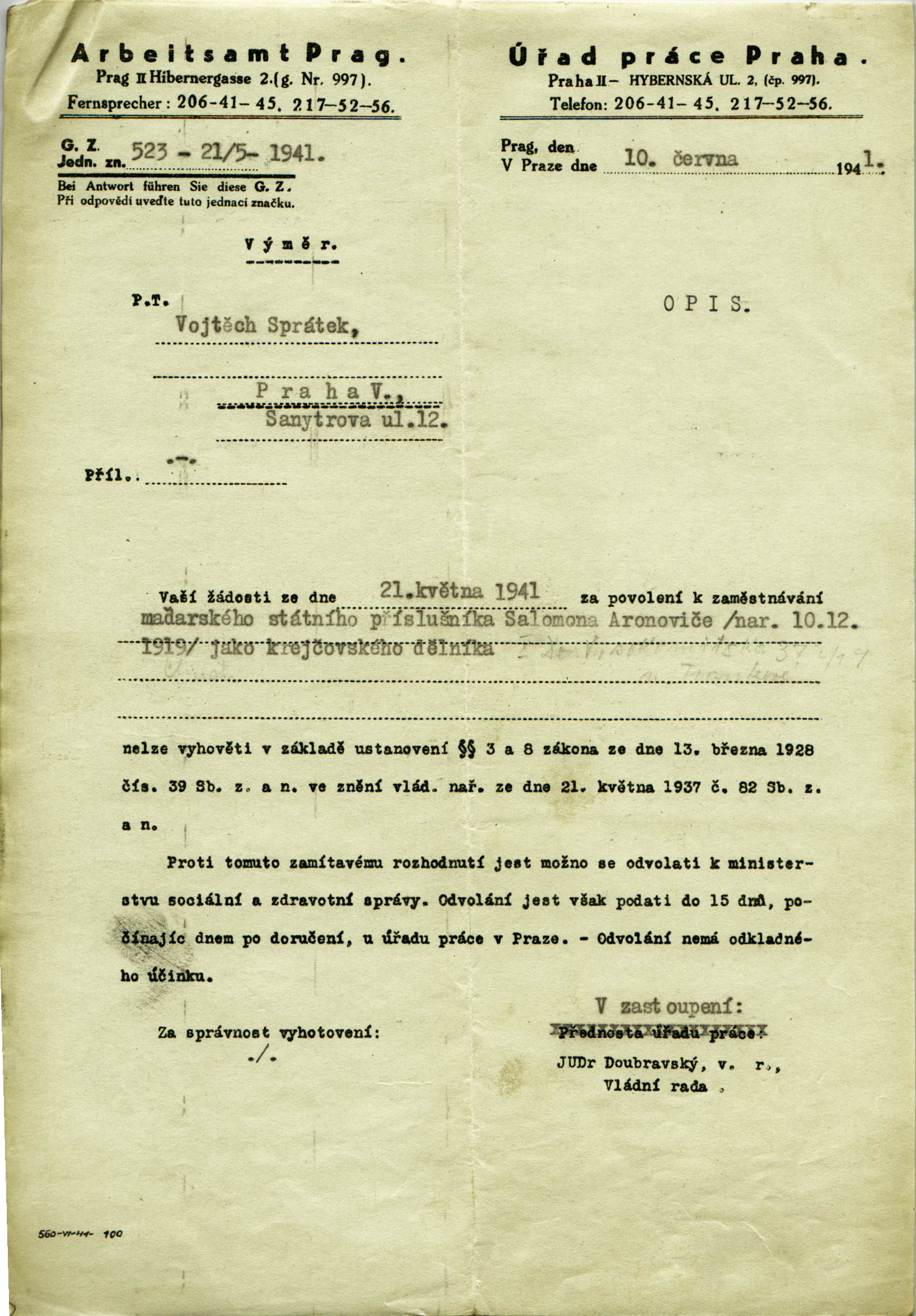 Aronovič Salomon: Zamítnutí žádosti o zaměstnávání