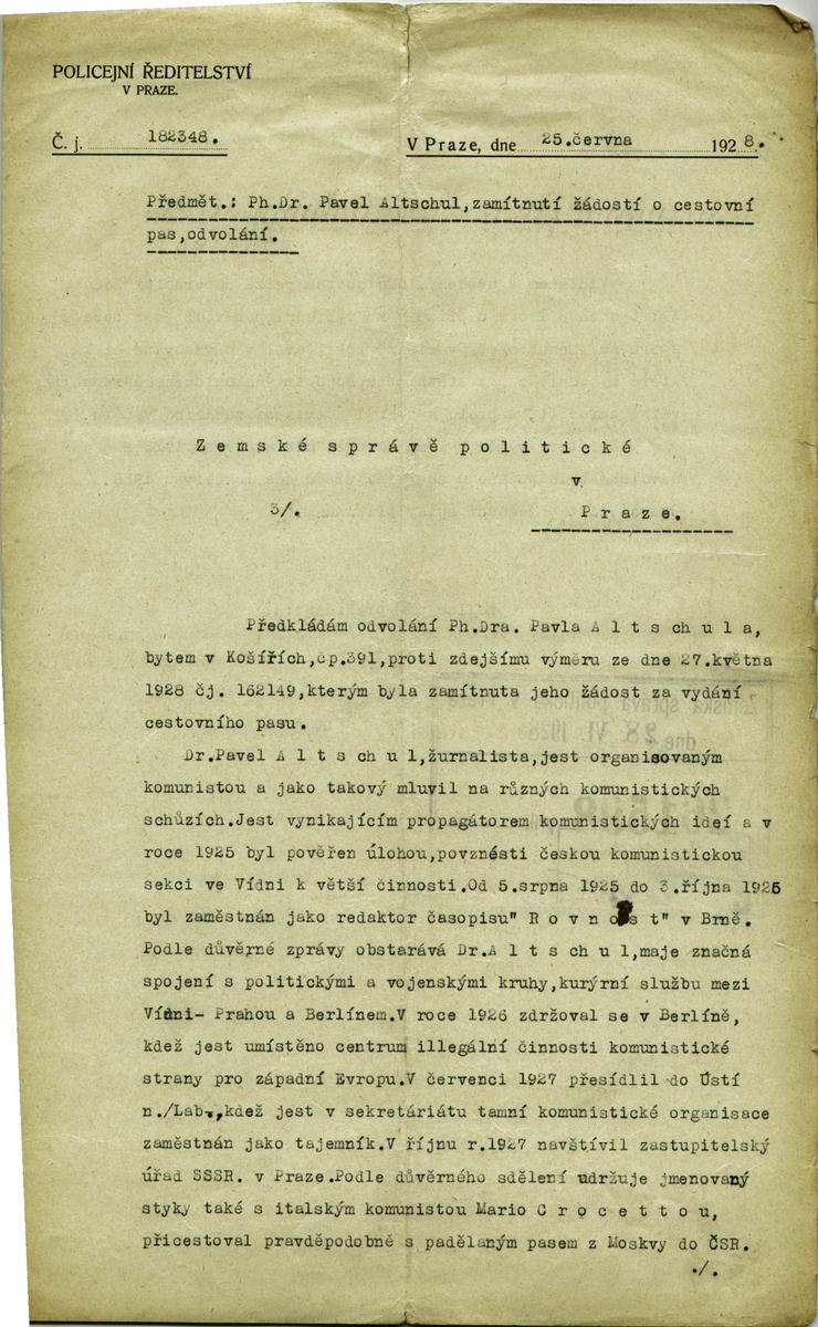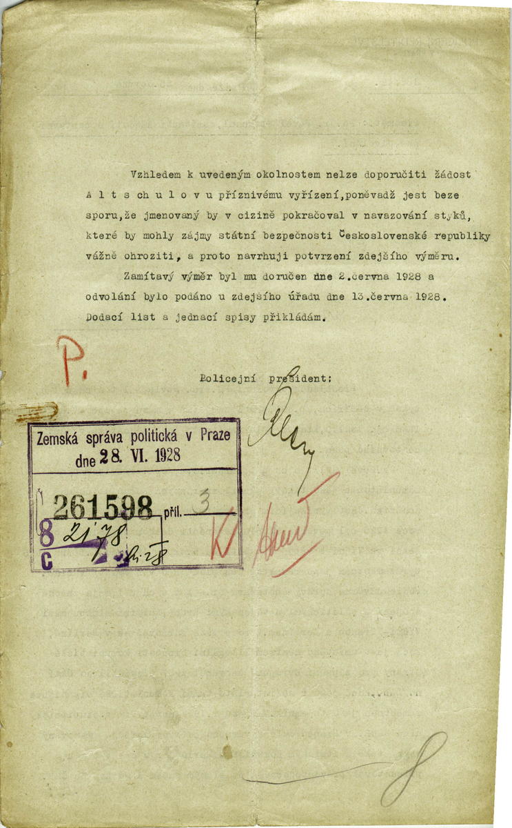 Altschul Pavel: Vyjádření k odvolání ve věci zamítnutí vydání cestovního pasu