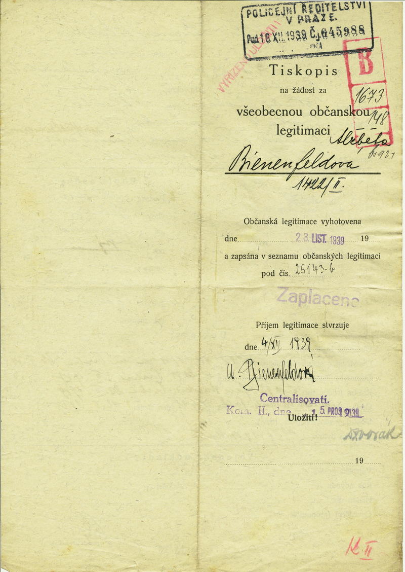 Bienenfeldová Elisabeta: Žádost o vydání občanské legitimace
