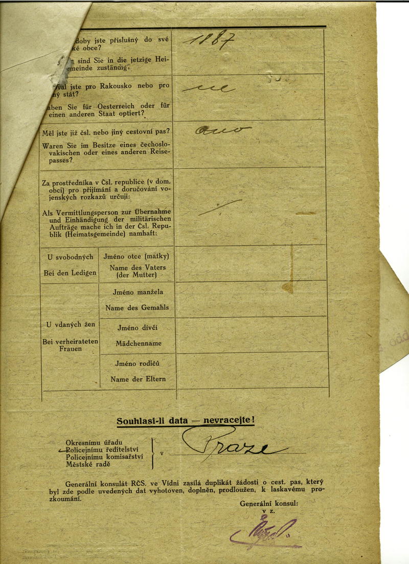 Arnstein Emil: Žádost o vydání cestovního pasu