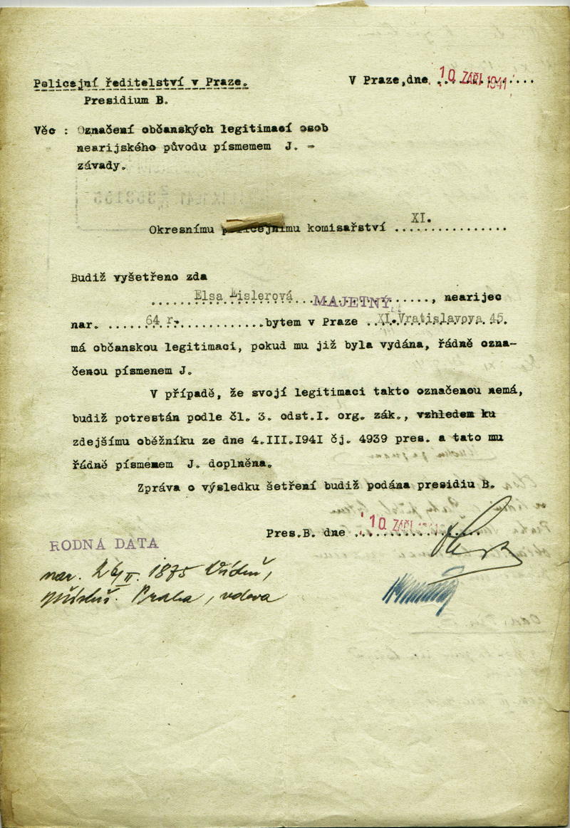 Eislerová Elsa: Letter J on the identity card