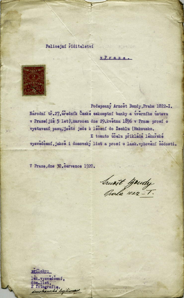 Bondy Arnošt: Žádost o vydání cestovního pasu
