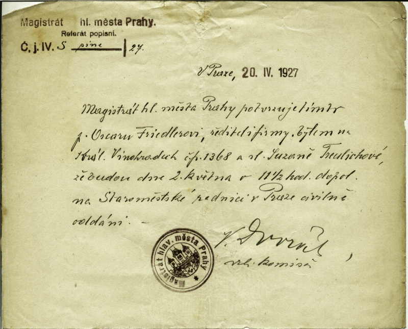 Friedlerová Zuzana: Potvrzení o chystaném sňatku