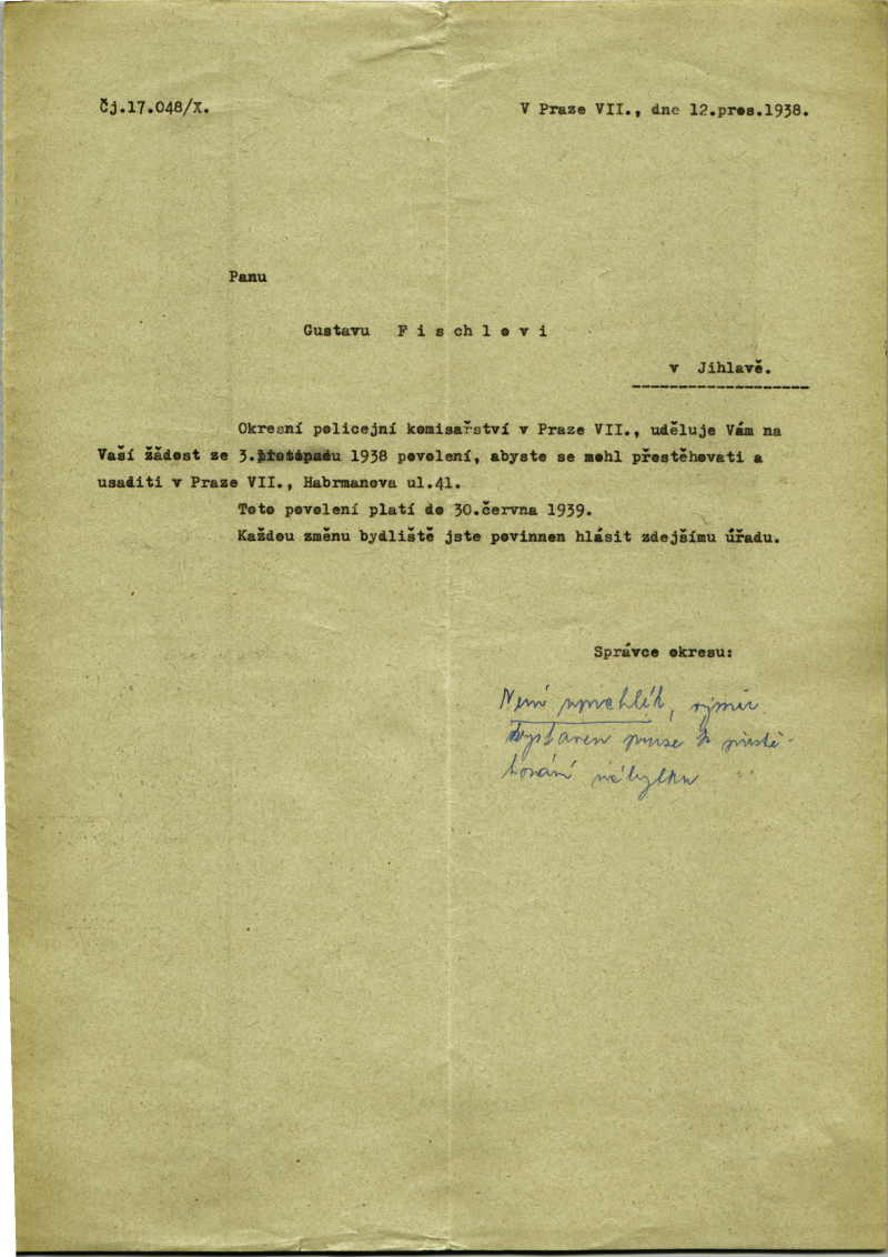 Fischl Gustav: Povolení pobytu