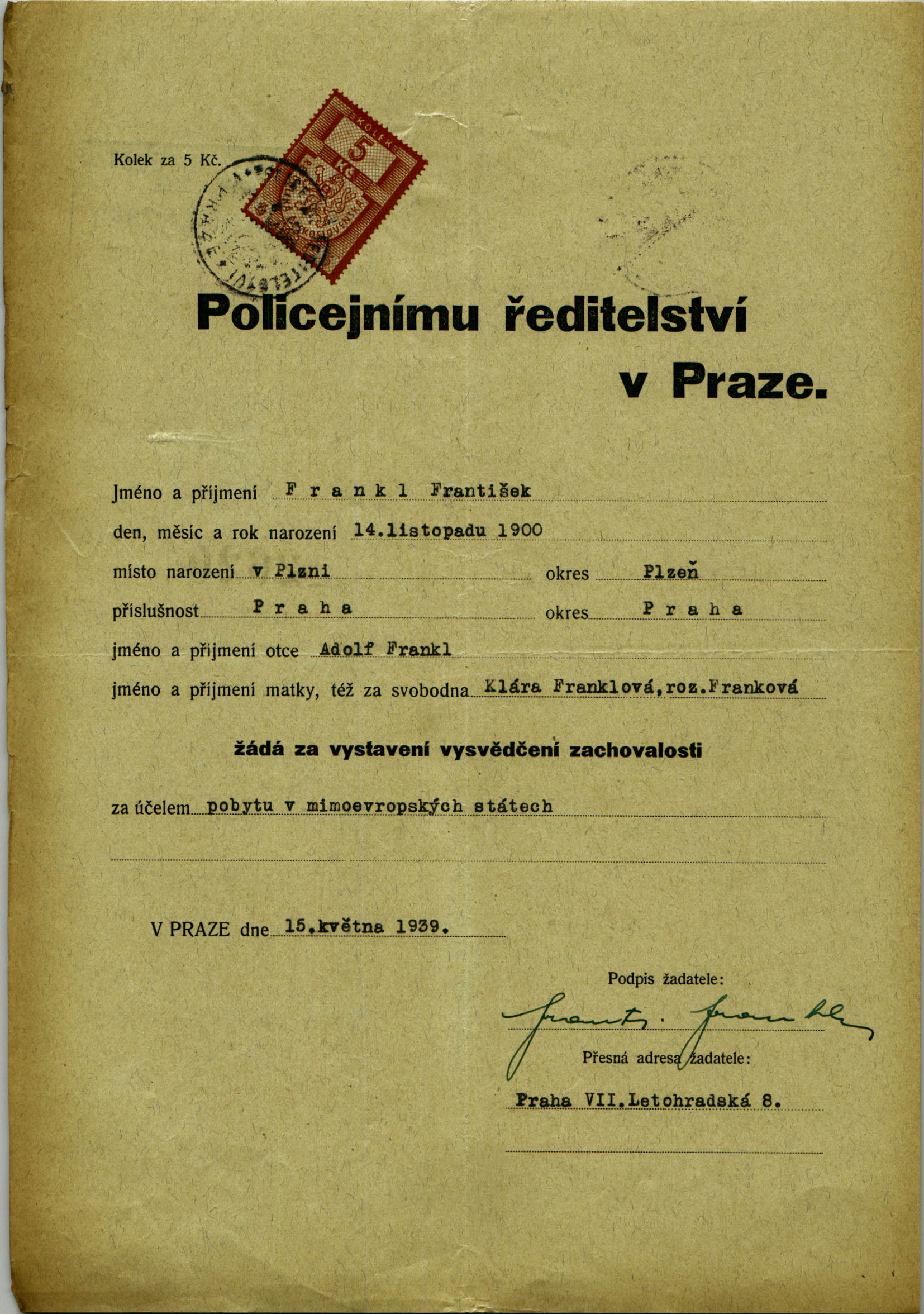 Frankl František: Application for probity certificate