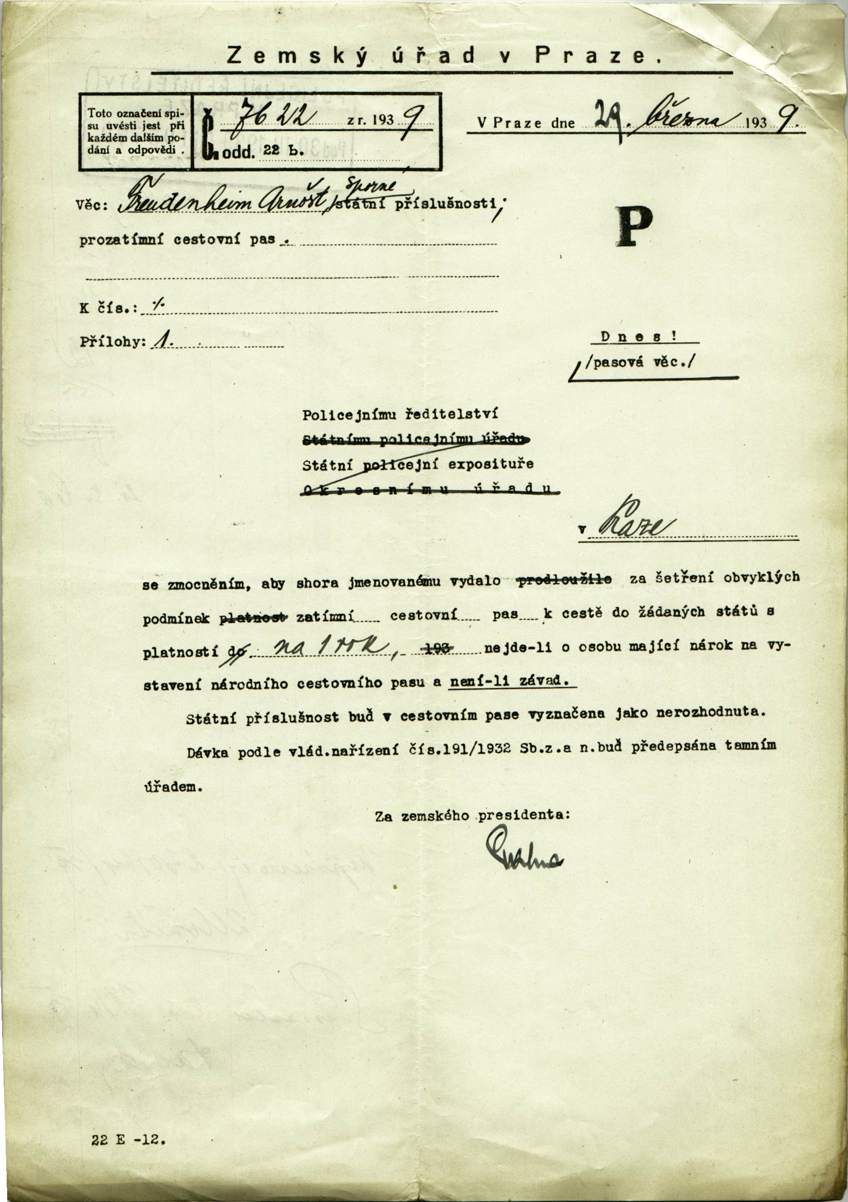 Freudenheim Arnošt: Souhlas s vydáním cestovního pasu