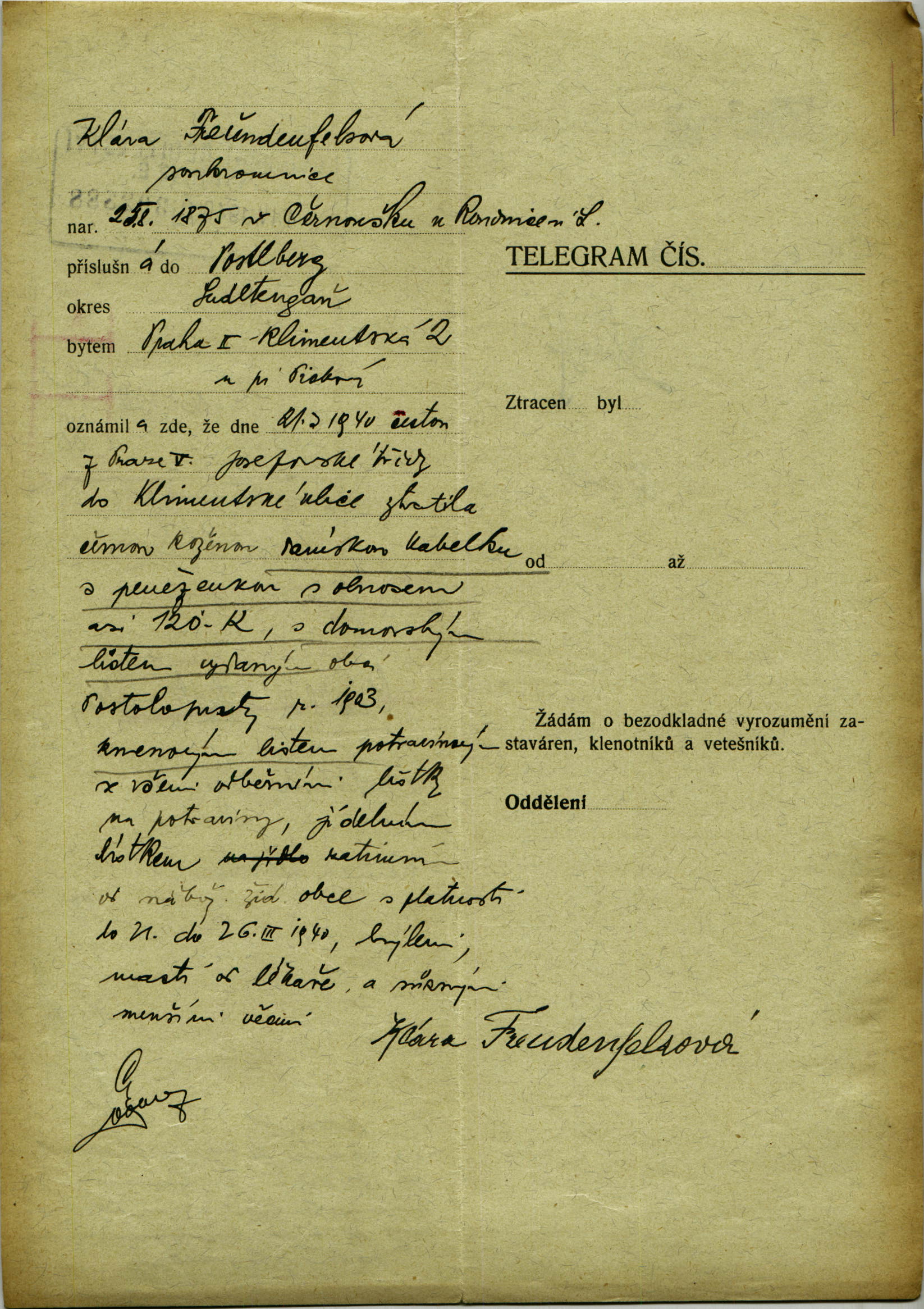 Nationalarchiv Prag > Polizei-Direktion Prag > 1941-1950 > F > Freudenfelsová Klára