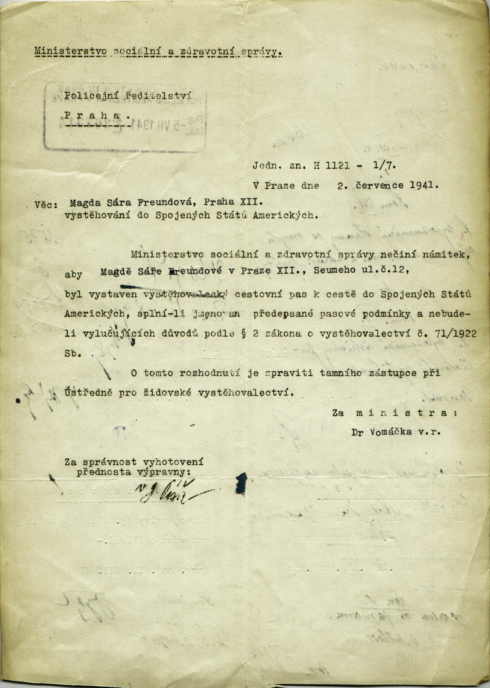 Freundová Magda: Souhlas s vydáním vystěhovaleckého cestovního pasu