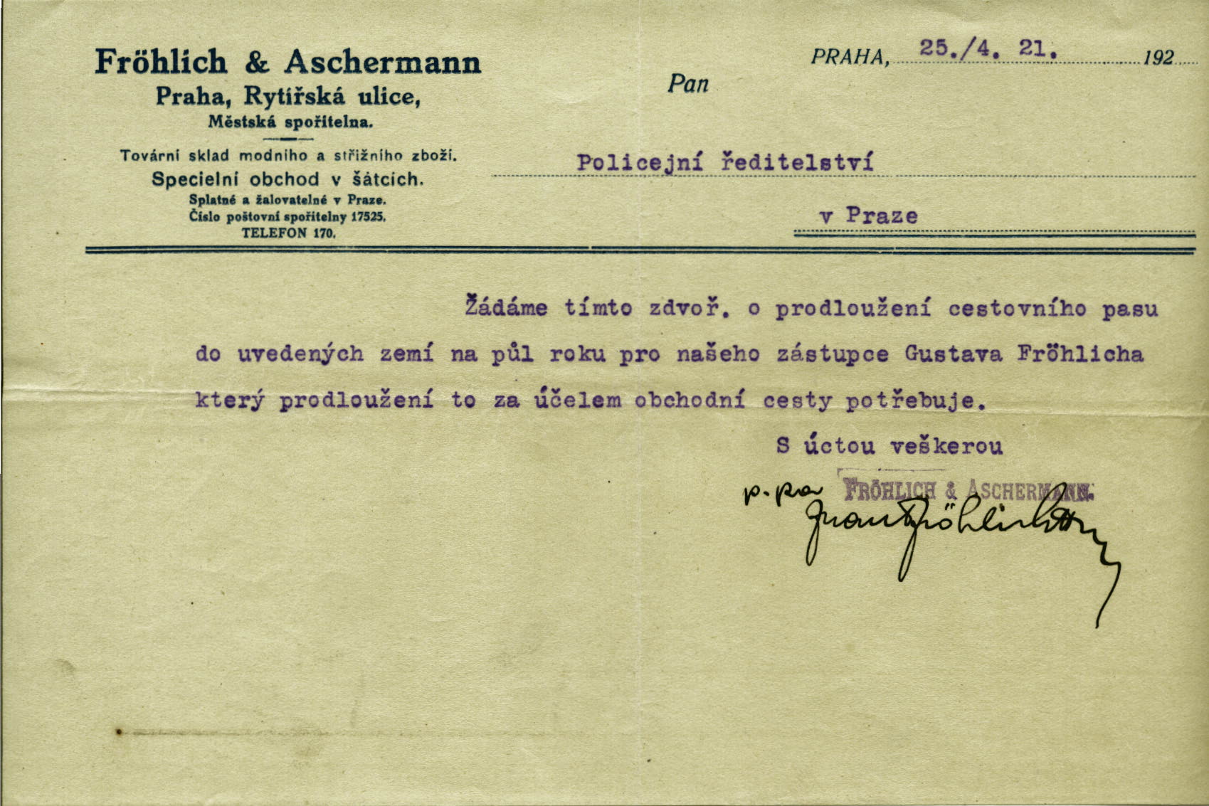 Fröhlich Gustav: Žádost o prodloužení cestovního pasu