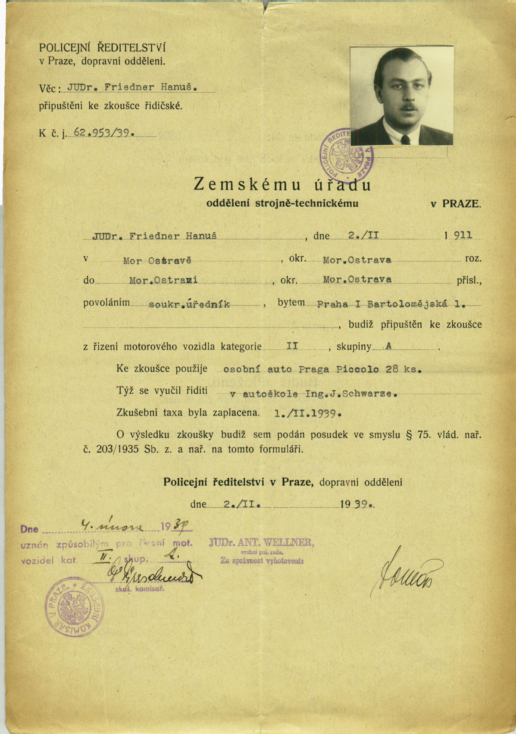 Friedner Hanuš: Připuštění k řidičské zkoušce