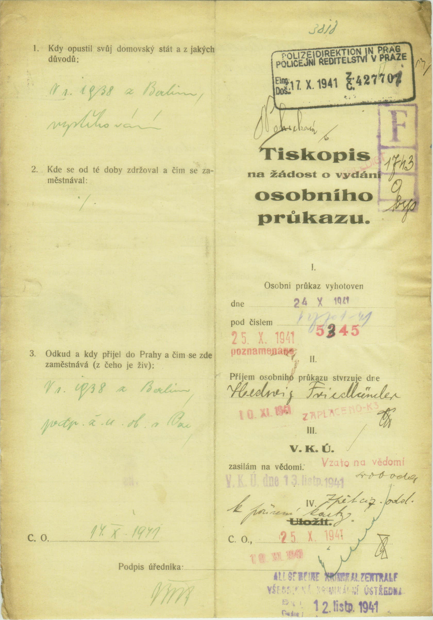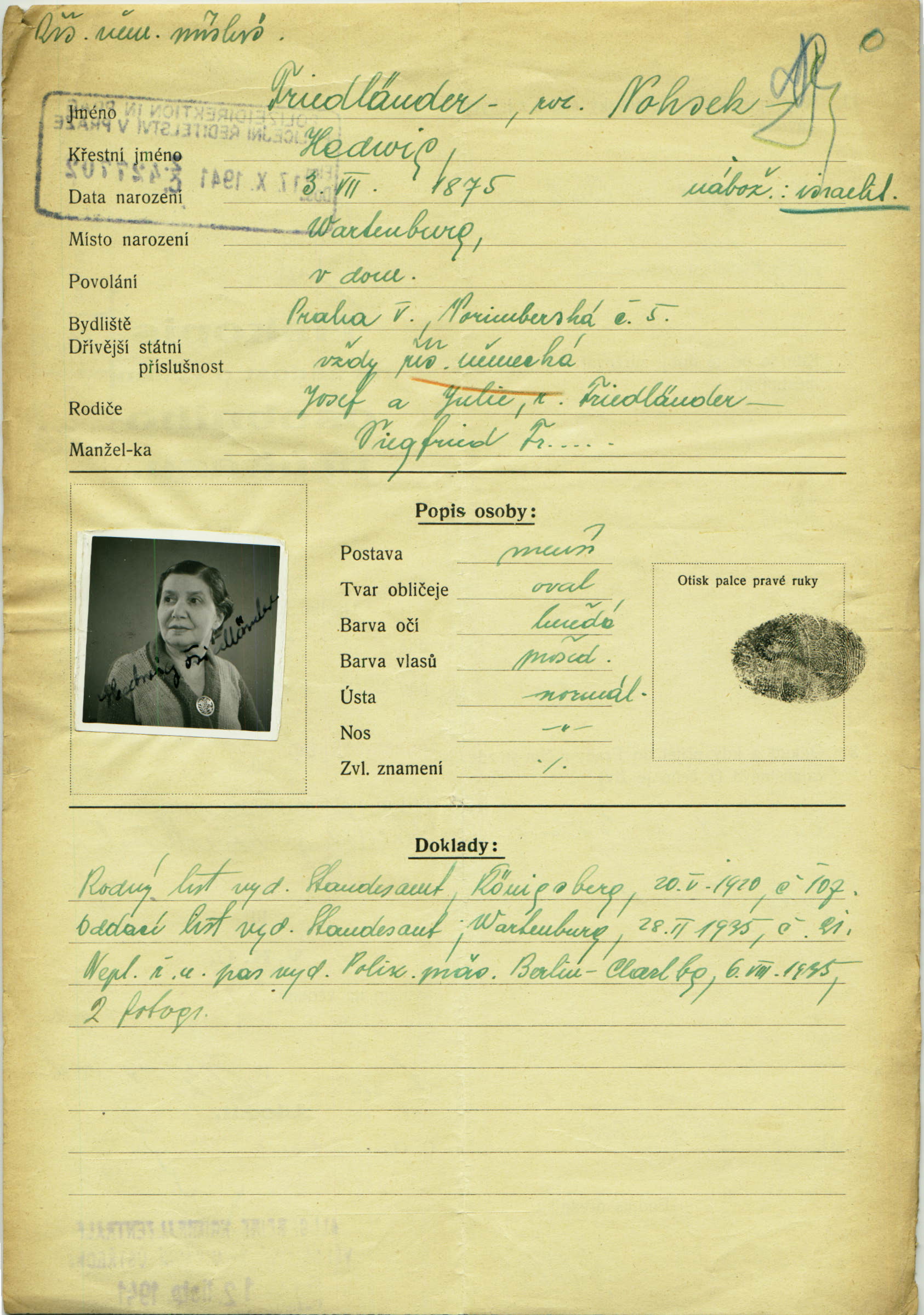 Friedländerová Hedvika: Identity card application
