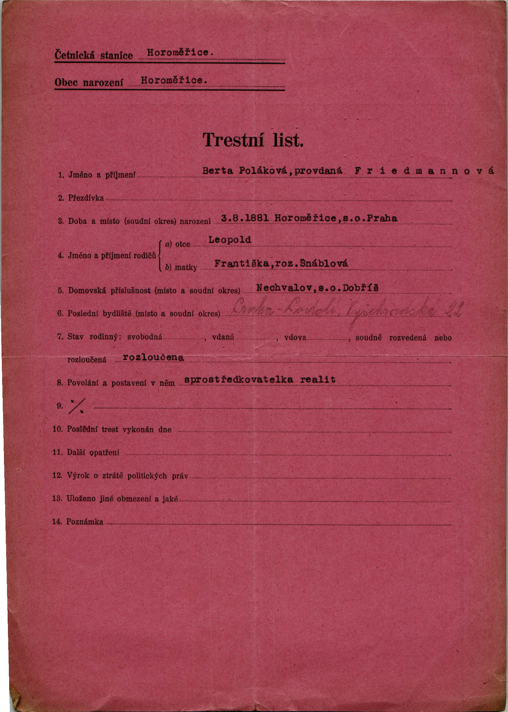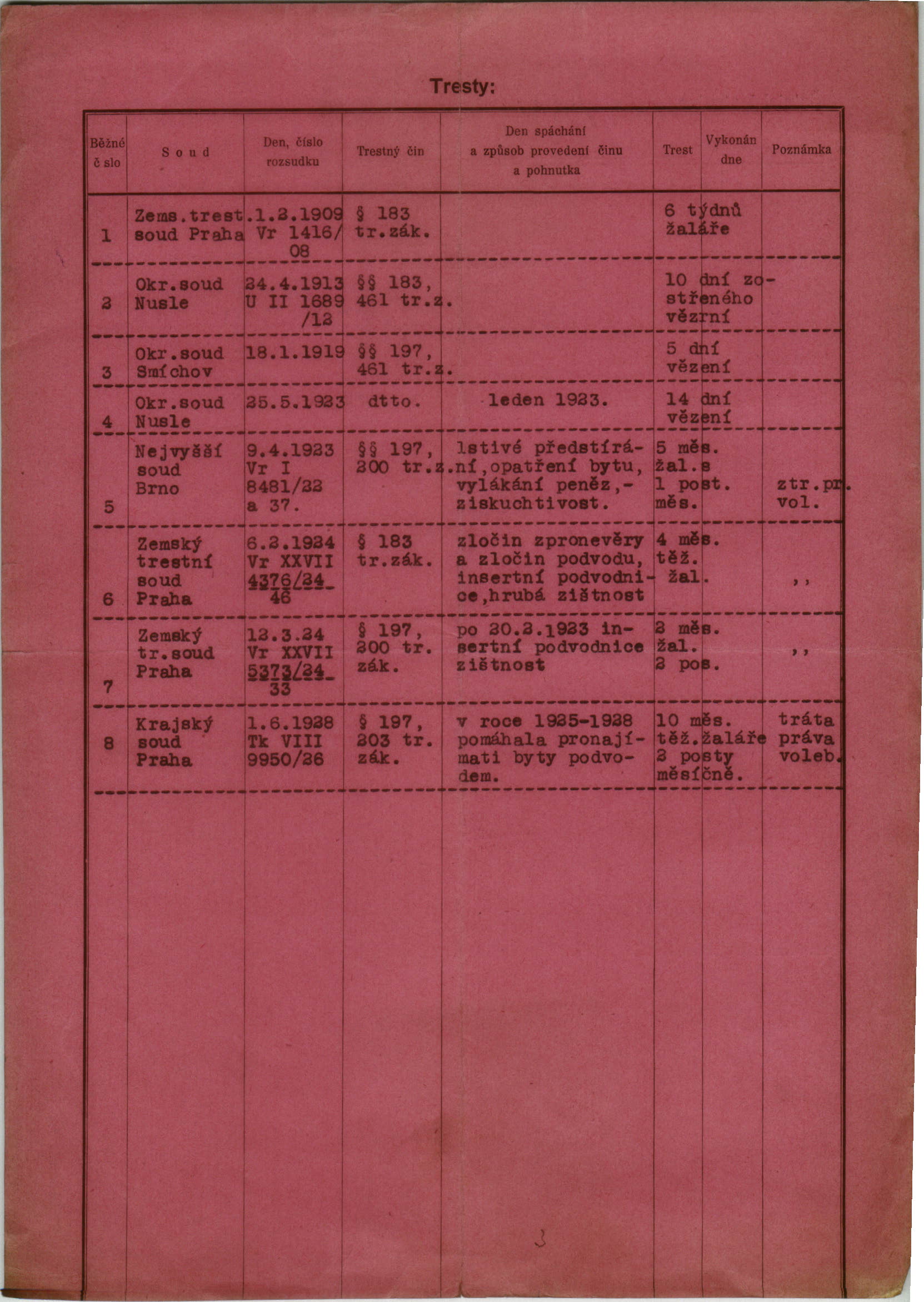 Friedmannová Berta: Trestní list