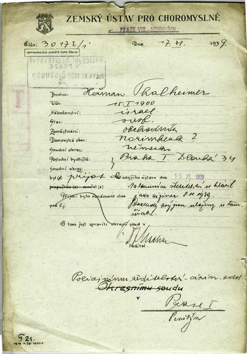 Thalheimer Heřman: Přijat do ústavu pro choromyslné