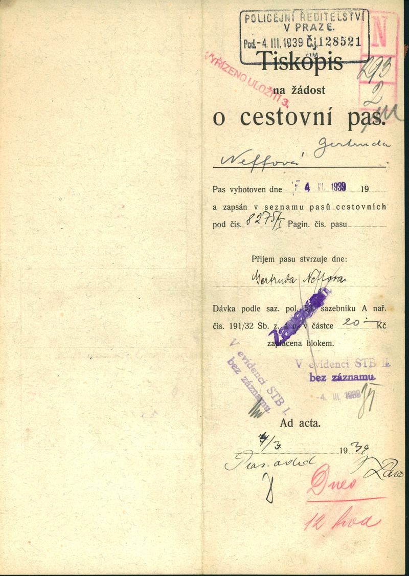 Nefová Gertruda: Žádost o rozšíření cestovního pasu