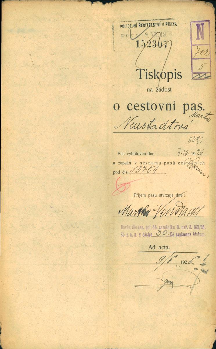 Neustadtlová Marta: Žádost o vydání cestovního pasu